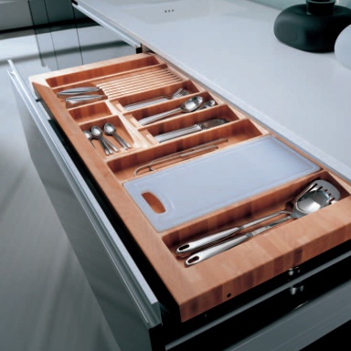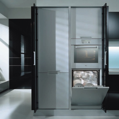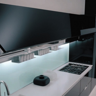 Kitchen Master from the Italian manufacturer Composit. The model is made in black glossy lacquered finish with white lacquered top Cristalan. Completion of the project , selection of finishing modules, and filling enclosures according to the customer to order.