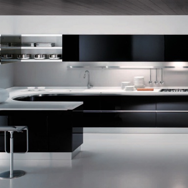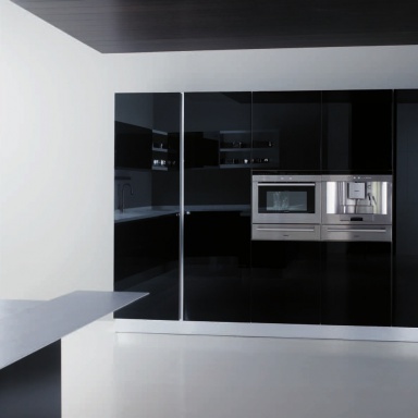 Kitchen Maxima from the Italian manufacturer Composit. Finish - gloss polished lacquer, available in 54 different colors. Wall cabinets with blind facades in lacquered finish and with glass. Island with a raised countertop of stone. For proper illumination of the working surface section is provided with illumination. Appliances are built-in a number of columns. All cabinets filled with pull-out baskets and shelves.