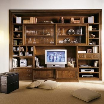 Modular set for the living room: TV Cabinet, cabinets, wall cabinets, open shelves and partition (mounted on panel). The frame is made of solid walnut / cherry. Swinging / sliding doors are available in "deaf" or glazed versions. Metal accessories in gold.