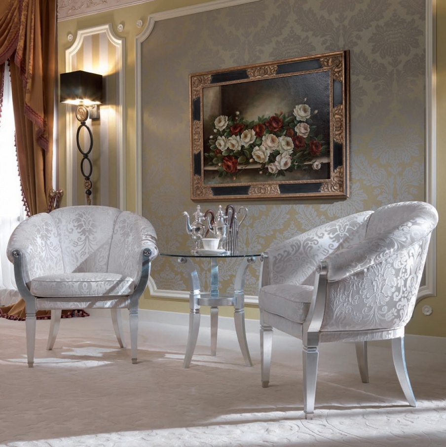 Mirby chair from the Italian manufacturer Turri. The structure is made of solid wood. The handmade decor. Finish - silver foil. The backrest has a curved wood padded with polyurethane foam. The tripod is made in a shiny chrome. The product is made in a classic style, a perfect choice for the living room.