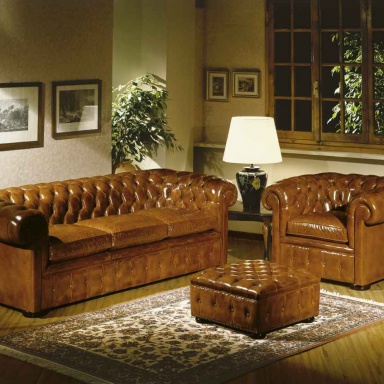 Sofa set from the Italian manufacturer Origgi Salotti. Consists of a triple sofa, armchairs and pouf. Low legs are made of solid wood. Frames fully upholstered in leather from the company portfolio. The seat cushion is removable. Filler - foam of varying stiffness. The armrests and backrest decorative decorated with stitch - Capito.Set made in a classic style.