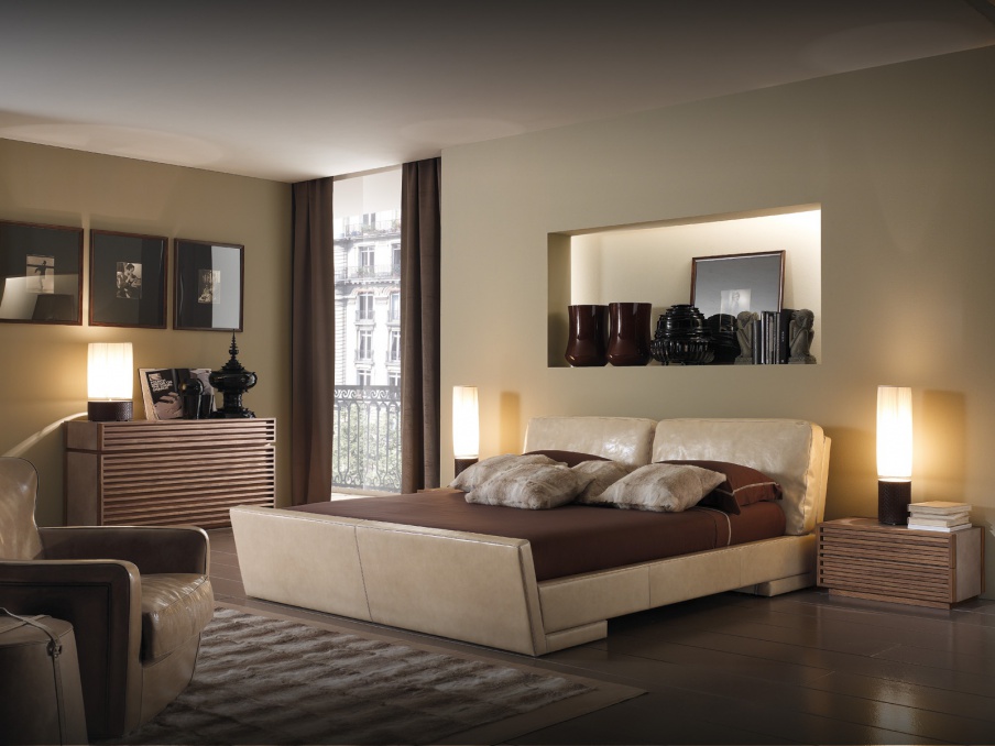 Set for bedroom collection Absolute from the Italian manufacturer Ulivi. Consists of double bed, bedside cabinets and dresser. Frames models made of natural wood. Finish to be selected from the range of the company. Headboard and platform are covered with skin. Color option - beige, the color of natural wood, brown. Set is manufactured in contemporary style.
