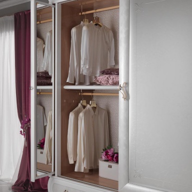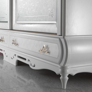 Headsets for bedrooms from Italian manufacturer Pistolesi. Set includes double bed with high headboard and a soft, bedside tables, wardrobe and chest of drawers. The furniture is made of solid wood of valuable breeds. Upholstery headboard - natural leather. Finishing varnish from the range of the campaign. D?cor - gilding. The design of complementary decorative pillows different shapes. Set is decorated with inlay. Fittings - gilding. Wardrobe with integrated mirror. The color of products is white.