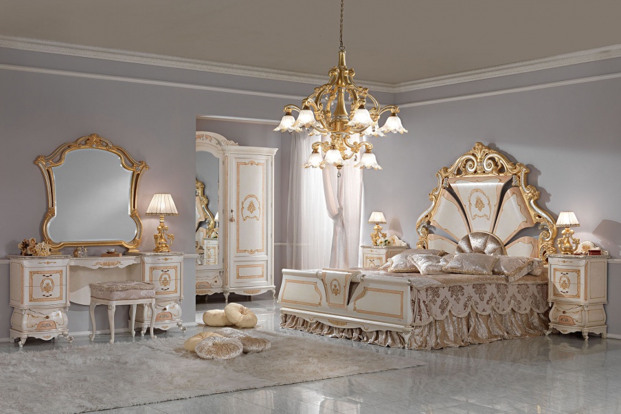 Headsets for bedrooms from Italian manufacturer Pistolesi. Set includes double bed with high headboard, chair, dressing table, two bedside tables and a wardrobe. The furniture is made of solid wood of valuable breeds. Upholstery - textiles from a range of campaigns. Decorative accessories - metal. D?cor - gilding. The finish is white lacquer. Set is decorated with inlay. The design of complementary decorative pillows different shapes. Colours in stock.