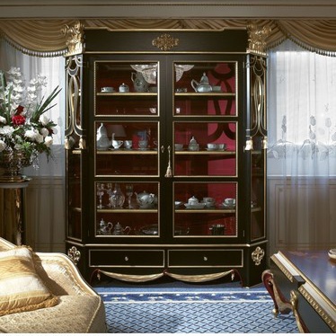 Showcase, from the Italian producer, Castello. The frame is made of wood. Finish - gloss lacquer from the company portfolio. The doors are made of glass. The model is decorated with decorative elements.