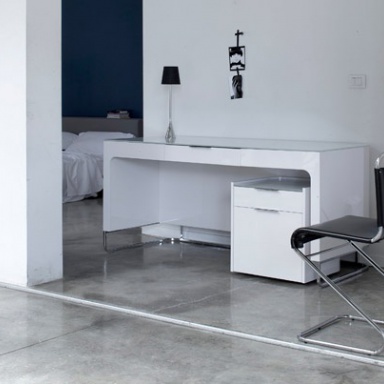 Desk HYANNIS PORT from French manufacturer Ligne Roset. Model from the designer Eric Jourdan (Jourdan Eric) in the style of techno. Complement the modern interior of the office, library or room of a teenager. The model is also suitable for office space. Writing Desk-writing Desk with slide out work surface can be supplemented with Cabinet on wheels with two doors and plenty of shelves and compartments for folders and other office needs. Finish: white shiny lacquer. Frame and stand made of chromed metal. The sizes of the pedestal are shown separately.