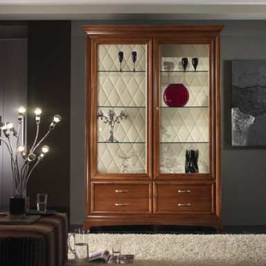 A display Cabinet from the Italian manufacturer at the stilema stand. The model is made of solid wood. Fronts and internal shelves are made of glass. Back panel upholstered in leather white color. The Cabinet contains drawers. The model is made in classic style.