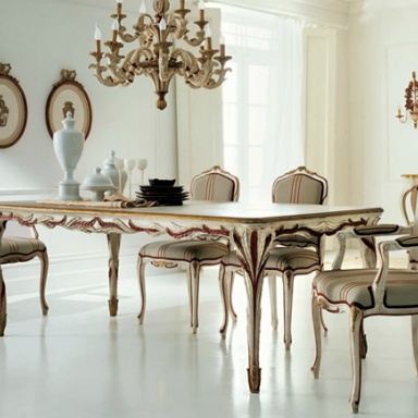 Set to yellow from the Italian producer Silvano Grifoni. Consists of dining table and chairs. Frames models made of solid wood. Chairs upholstered in fabric from the company portfolio. In the CE model with decorative carving covered with gold leaf. Set is distinguished by elegance and reliability. Made in the classic style.