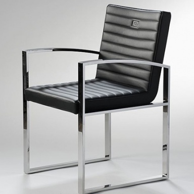 A Unique chair from the Italian producer of Versace Home. Model with hard armrests. The frame and legs are made from chromed metal. Seat and back upholstered in black leather and decorative stitching. The chair is made in a modern style. Is characterized by durability and practicality.