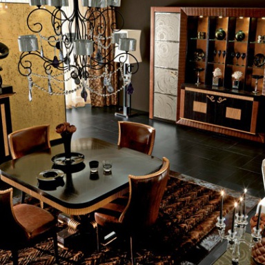 Consists of dining table, showcase, cupboard and chairs. Material - solid wood. The frame is covered with varnish. The chairs are made of wood. The model is decorated with carving. The facade Windows are made of glass. Upholstered in textile or leather from the company portfolio. The back is slightly rounded. The table is made in square shape. Colors - brown, silver.