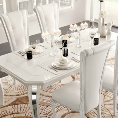Italian dining room set for the production of Florence Collections solid wood. Consists of dining table and chairs. Material - solid wood. The frame is covered with varnish. The chairs are made of wood. Upholstered in leather from the company portfolio. The legs are made in the form of Cabriole, with metal decoration. Colours - white, silver. Set is made in modern style.