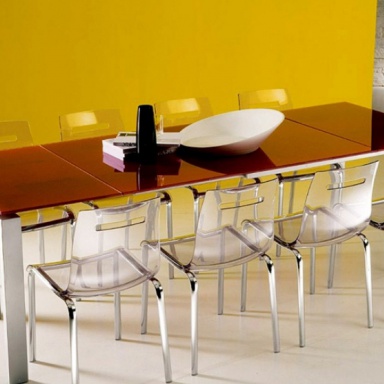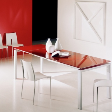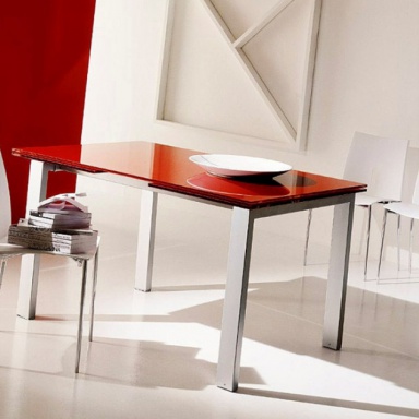 The sliding Telesio dining table from Italian manufacturer Bontempi Casa. The frame is made from metal, the table top is glass. The model will decorate the interior in a modern style. Color scheme: red, steel.