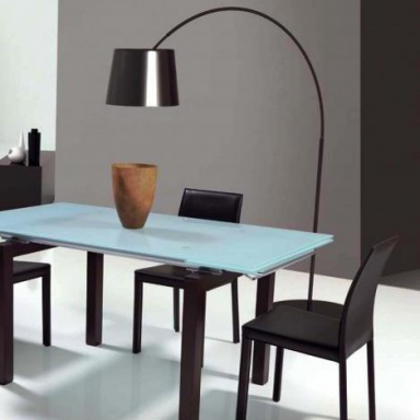 Set for the dining room of the Italian manufacturer Di Lazzaro. The presented model dining table and chairs. Made on wooden frame, glass top. From the manufacturer color is black in combination with blue glass countertops. The modern style of execution.