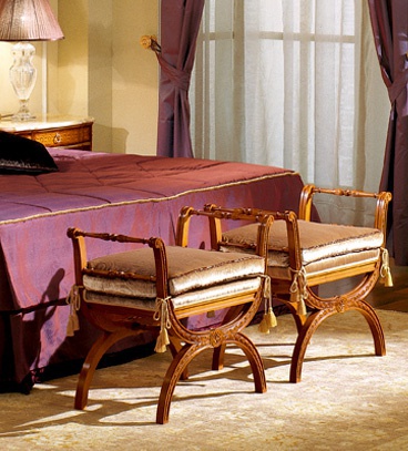 Bench Bellini from Italian manufacturer Colombo Mobili. The frame is made of wood. Upholstery - textiles from the company portfolio. The legs are made in the form of Cabriole, armrests wrapped. The model is decorated with carved elements and textile brushes. The bench is made in the classic style.
