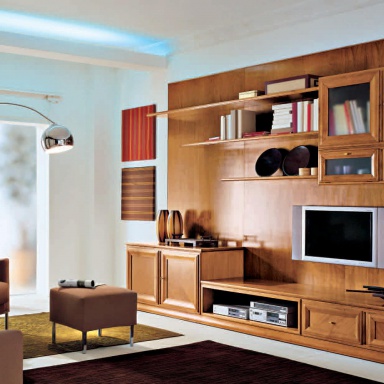 Modular system from Italian manufacturer Sangiorigo. The model is made in a modern style. Includes several open shelves, sections with blind and glazed doors and drawers. The Cabinet is made of solid wood. Offers a glossy finish or a matte varnish.