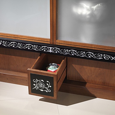 The doors of the cabinets leaving glass doors are frosted and transparent. In the centre of the base is a small drawer.