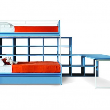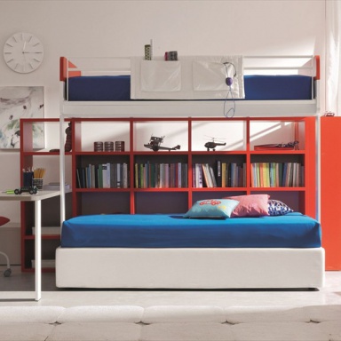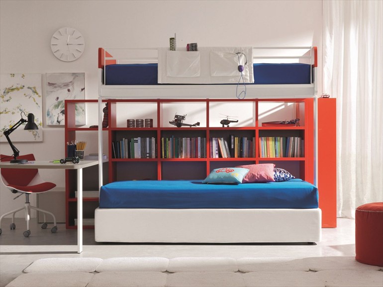Bunk bed Castello di Robin from the Italian manufacturer Zalf. The frame is made from solid wood and metal. The surface is treated with varnish from the range of the factory. The model is equipped with drawer storage, open shelves and built-in Desk. Design in modern style. Colors: white, red, blue.