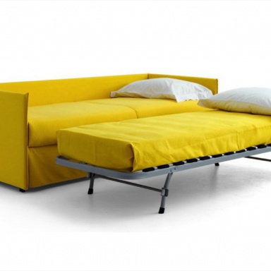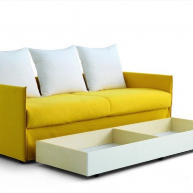 Sofa bed Bino from the Italian manufacturer Zalf. The frame is made from solid wood, removable upholstery - cloth from the assortment. Filler - polyurethane foam. The model is equipped with a drawer for storage. The design of complementary decorative pillows. The style is modern. Product color yellow.