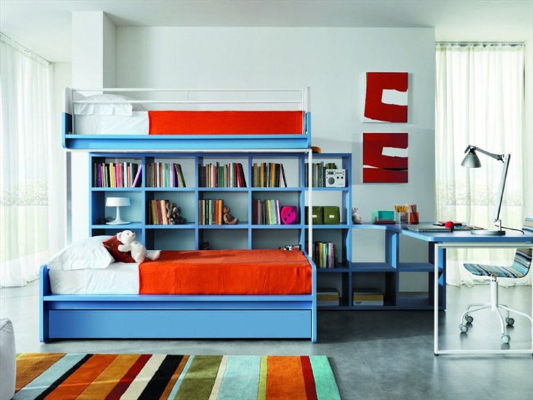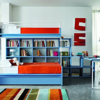 Set for kids room from Italian manufacturer Zalf. The set includes: bunk bed with drawer storage, shelving and Desk. The furniture is made of solid wood in the finishing varnish from the range of the factory. Metal supports. Set in a contemporary style. Colors: white, blue.