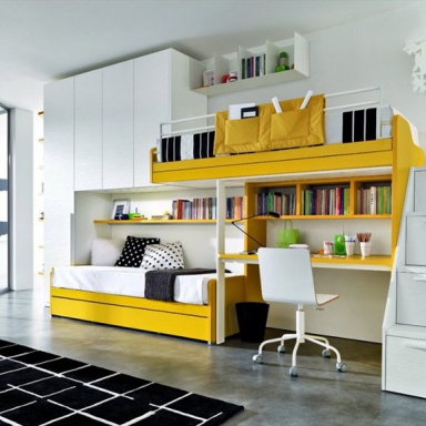 Set for kids room from Italian manufacturer Zalf. Includes: two beds, a module for books and clothes and a Desk. The furniture is made of solid wood and metal. The surface is treated with varnish from the range of the factory. The lower bed is equipped with a drawer for storage. The built-in stairs drawers. Set in a contemporary style. Colors: white, yellow.