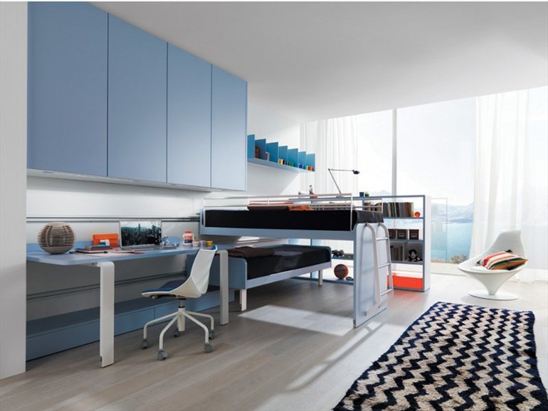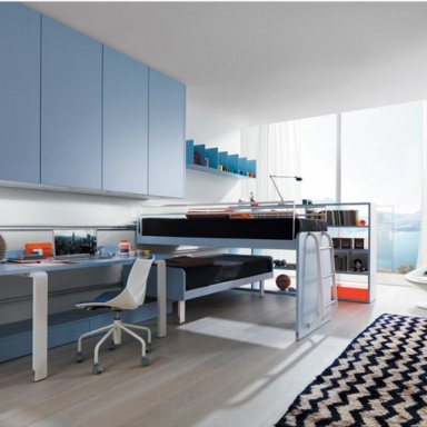 Set for kids room from Italian manufacturer Zalf. Includes: bunk bed, the storage unit of clothes, shelves for books, Desk and shelving. The furniture is made of solid wood and metal. Finishing varnish from the range of the factory. Design in modern style. Colors: white, blue.