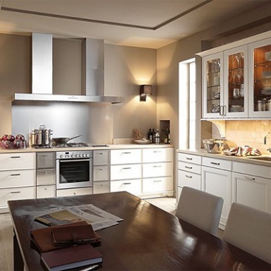 BeauxArts kitchen cabinets from German manufacturer SieMatic. The model is made in classic style. Finish - gloss lacquer white. Set consists of a variety of cabinets and storage. The table top is made of stone. Fittings - metal. Shelves and hinged door system durable glass.