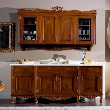 Set for the kitchen from Italian manufacturer Lubiex. Model with a number of mounted and floor lockers. Body and legs made from solid wood. Sash glazed and deaf. Accessories metal. Decoration is the decorative carving handmade.
