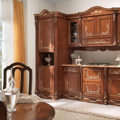 Set for the kitchen from Italian manufacturer Lubiex. The model is made in classic style. Material - solid wood. The surface is treated with glossy varnish and gilding. Glass sash and blind. Handles are metal. Decorated with handmade carving.