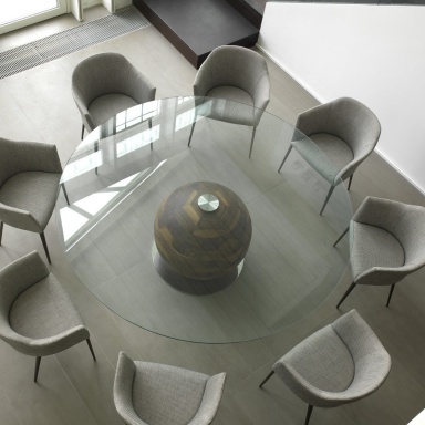 The Grace chair from the Italian manufacturer Porada. Model with round back and curved arms on a metal frame with legs in walnut veneer. Provide superior strength and support. Upholstery textile or leather. Filler - polyurethane foam of different densities. Made in a modern style.