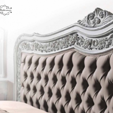 Headsets for Itaca bedrooms from Italian manufacturer Angelo Cappellini. Set includes a double bed, two bedside tables, a dressing table, bench and chair with armrests. Double bed with high headboard. Headboard with quilted upholstery edged carved frame. Tables on figured legs fitted with two drawers. A dressing table is also equipped with drawers and completed with mirror in a frame. Chair with high back and armrests is available in soft upholstery. Furniture for the headset is made of wood and decorated with handmade carving.