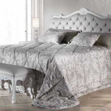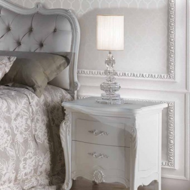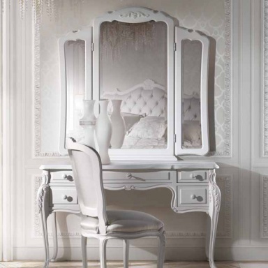 Set for bedroom Ponza from the Italian manufacturer Angelo Cappellini. Set includes double bed, two bedside tables, dressing table, mirror, stool and chair. Double bed with high headboard. Headboard with quilted upholstery edged frame with carved decoration. Bench on six legs and upholstered textiles. Tables on figured legs fitted with two drawers. A dressing table is also equipped with drawers and completed with mirror in a frame. Mirror - tricuspid. Chair with high backrest without armrests is available in soft upholstery. Furniture for the headset is made of wood and decorated with handmade carving. The predominant color is white.