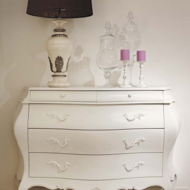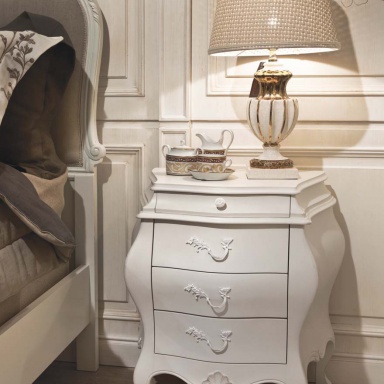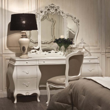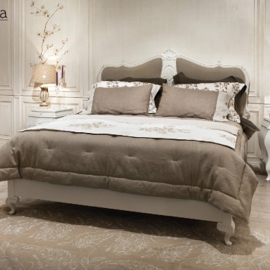 Set for bedroom Maiorca from the Italian manufacturer Angelo Cappellini. Set includes a double bed, two bedside tables, chest of drawers, dressing table, mirror, and chair. Double bed with high headboard. Headboard with upholstery fabric in the frame with carved decoration. A chest of drawers and bedside tables of the original form on figured legs with sliding drawers. A dressing table is also equipped with drawers and completed with mirror in a frame. Mirror - tricuspid. Chair with high backrest without armrests is available in soft upholstery. Furniture for the headset is made of wood and decorated with handmade carving. The predominant color is white.