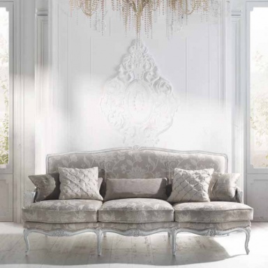 Corfu sofa set from the Italian manufacturer Angelo Cappellini. Set includes three seater sofa and an armchair with a high back and small arms. Frame and shaped legs made from wood and varnished. The upholstery is made of textiles, cushions - removable chocks. Decoration are decorative pillows of different sizes and shapes. Coffee tables complement the set. Central table rectangular shape two small pridivannogo table round shape that can be used as coffee, phone and at your discretion. Furniture for the headset is made of wood and decorated with handmade carving.