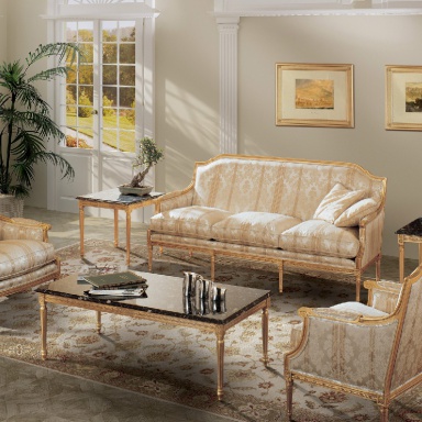 Dante sofa set from the Italian manufacturer Angelo Cappellini. Set consists of sofa, two armchairs and a coffee table with a marble top. Sofa and armchairs with armrests and low backrest. The seat cushion is removable. The upholstery is made of textile. Supplement design is decorative pillows. Set for the living room can not do without coffee tables. Offered a coffee table of rectangular form, which is located in the center, and two small square tables. Countertops made of marble. All the items of furniture for the headset is made of wood and decorated with handmade carving.
