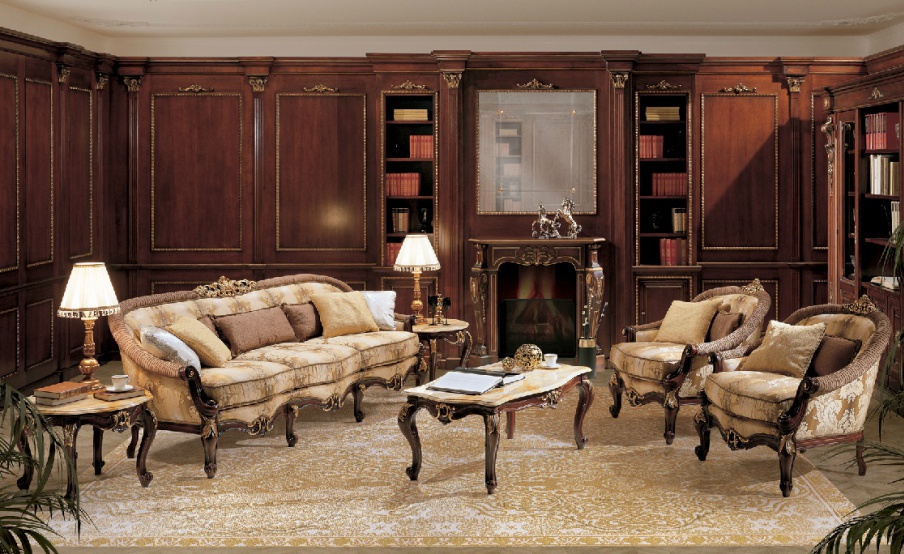Sofa set Guicciardini from the Italian manufacturer Angelo Cappellini. Set consists of a triple sofa, armchairs and coffee tables of different sizes and shapes. Sofa and armchairs with a frame made of wood carved with gold-plated details. The upholstery is made of textile. The seat cushion is removable. Supplements set Central coffee table has a rectangular shape and two smaller round table predivnih. Tabletops are made of marble. The frame is carved with gold-plated elements. Italian living room furniture in Baroque style.