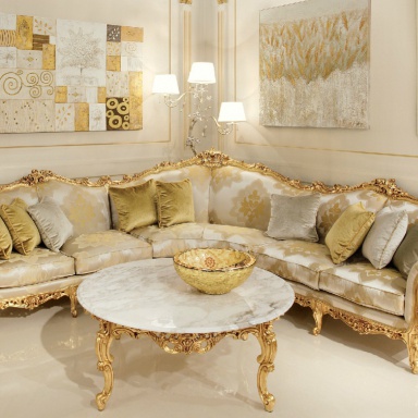 Sofa set Cechov from the Italian manufacturer Angelo Cappellini. Set consists of a large corner sofa and coffee table. Sofa five seats, one corner seat, two seats to the right and two to the left. The frame is made of wood. The armrests are rounded. The backrest upholstery is edged with a carved frame. The upholstery is made of textile. Complement the design of decorative cushions. Coffee table with carved curved legs. The counter is made of marble. A set of Italian furniture for living room in Baroque style.