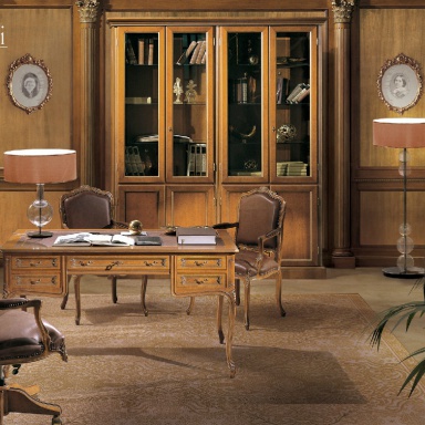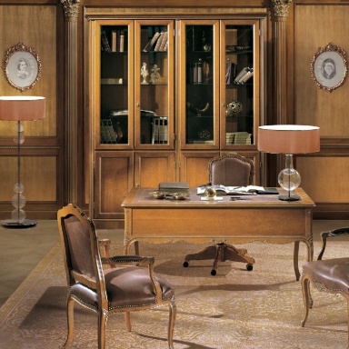 Headsets for office Bernini from the Italian manufacturer Angelo Cappellini. Set includes a Desk, a bookcase, a chair on wheels and chairs with armrests. The table on bent legs equipped with five drawers, and the top covered by skin. Swivel chair on castors and the chairs with armrests upholstered in leather from the company portfolio. On the arms have soft pads. The bookcase is offered with four glazed doors and glass shelves. Furniture for the headset is made of wood and decorated with carved decoration. Finishing made with lacquer. Colours in stock.