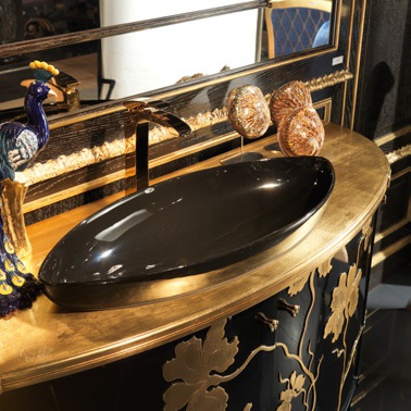 The Cabinet under the sink oval shape Iris the Italian manufacturer Bizzotto. The model of low tables on wooden legs, oval. Color in black with gold painted flowers and countertop. Has a sink oval shape in gloss black finish. Design complete wall and ceiling panels from the collection of the First Taormina, antique black with gold. Design solution for decorating your bathroom.