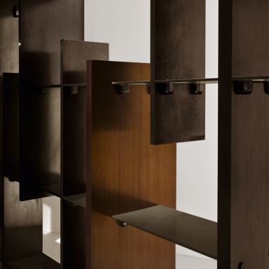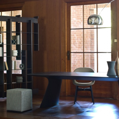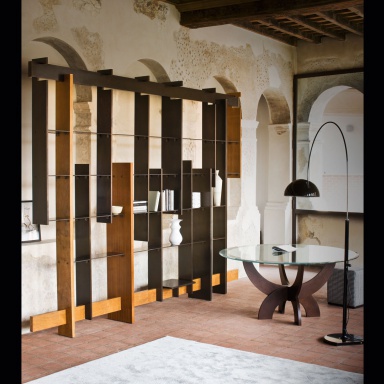 Rack f.t.b. for books from the Italian manufacturer Busnelli. The frame is made of natural wood, the surface is treated with varnish or wax from the range of the campaign. Shelves made of wood, tempered glass or metal. The rack can be mounted to a wall or can stand separately. The model is designed for modern interiors. Colours in stock.