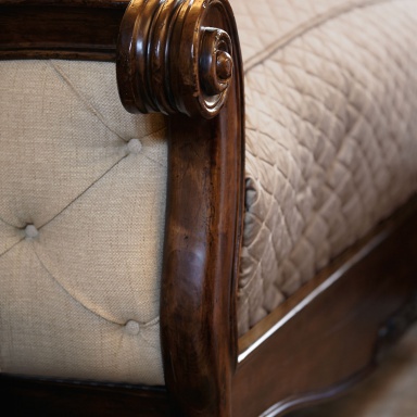 Bed Eaton Square from the American manufacturer Bernhardt. The manufacturer offers a double model in three different sizes: King, California King, Queen. Model with a high headboard and footboard are made of wood. Headboard and footboard in carved frame, upholstered with textile fabric and embellished with stitch.