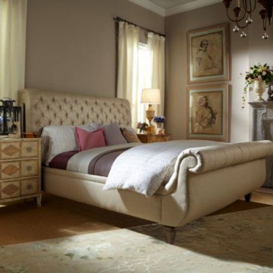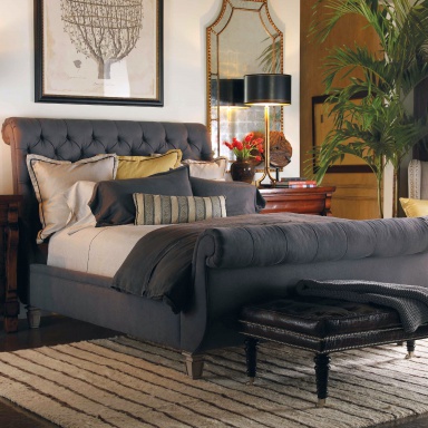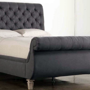 Bed with high headboard Devonshire from the American manufacturer Lillian August. The furniture is executed in classical style. Bed frame is made of durable solid wood that makes it durable in use, the legs are decorated with a manual carving. Textile upholstery ashen high upholstered headboard with stitch Capito. Possible color variations in accordance with the manufacturer's catalogue.