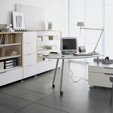 Desktop EVERYWHERE from French manufacturer Ligne Roset. Oval desktop from practical easy-care laminate with a bedside table with one drawer. The table may include a rack for folders or rack for CD/DVD. Table top in white lacquer, the bedside table: white lacquer or oak. The model is made in modern style.
