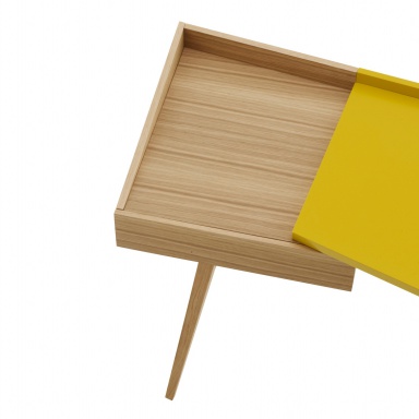 LITHO Desk from French manufacturer Ligne Roset. The table embodies a poetic approach to the creation of the working area. Desk with the slim oak legs. Left side of the table fitted with a drawer, covered with oak veneer, stained black, or has a natural oak color. To create contrast right side varnished. The model is made in modern style.