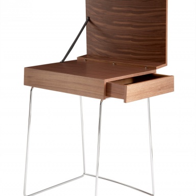 Desk POM'S from the French manufacturer Ligne Roset. This sleek and elegant Desk different cover and box (Cabinet) to the right. Finish in choice of maple or walnut wood; interior trim box made of genuine leather (maple) or black leather (walnut); strap of the same skin. The base is made of chrome plated steel. The model is made in modern style.