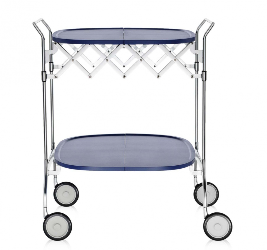 Gastone serving table from the Italian manufacturer Kartell. Gastone is an elegant and practical folding trolley with table top made of painted plastic and frame from chrome plated steel. Color range includes five shades: white, black, blue, plum and cream. The wheels are a distinctive element, ensuring functional mobility. In the closed position, its width is 23 cm, which greatly simplifies storage.