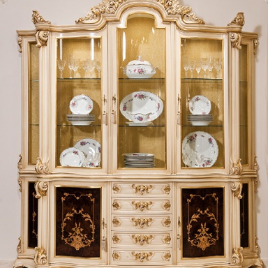 | Description: | The sideboard has 3 doors and 5 drawers. The frame is solid wood with hand carved inlaid with gold inserts. The back wall showcases in the tissue. Interior lights. Finish as in the photo. |