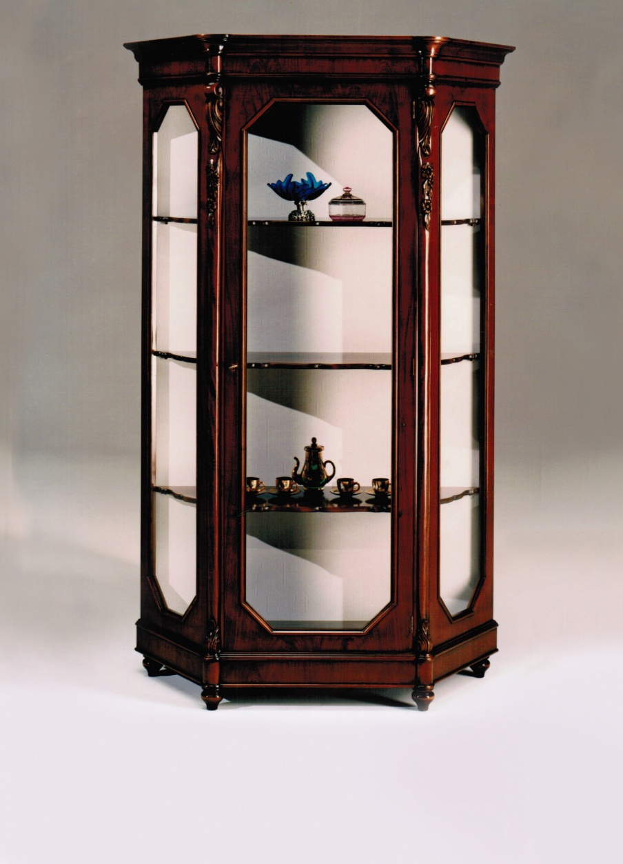 Showcase from Italian manufacturer Moletta Mobili. Showcase in walnut finish. The decor is a thread in the columns. The showcase is equipped with one glass door, wooden shelves. Showcase of irregular shape, with sides at 45 degrees. The soft tissue on the back wall adds refinement to the product. Showcase is made in the classic style. Fits perfectly in living room, dining room. Finish as in the photo.