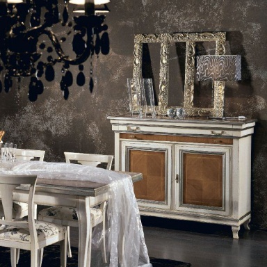 A snack bar Armonie from the Italian manufacturer Arve Style. Tool with two hinged doors, drawers, short curly legs. Frame, the base is made of solid walnut. The external finish can be executed like walnut, pine or cherry. The inside is made of Tanganyika. The layout of the fibers on the doors forms a diamond-shaped figure. The surface is lacquered, and artificially aged. Decorations are the silver slats on the facade. Accessories metal, and elegant. The buffet will perfectly fit into the classic interior of living room, dining room.