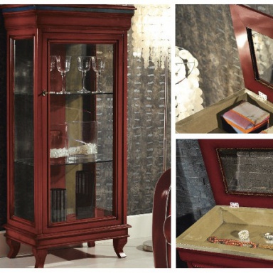 Showcase Armonie from the Italian manufacturer Arve Style. Frame, base made of solid wood. Finished with veneer of valuable species. Finishing of textiles, catalogue of the manufacturer. The walls and shelves of clear glass. The surface is lacquered, glossy. The color palette to choose from the range of available wine shade (as pictured). The product on figured legs, which gives the design lightness and elegance. Perfectly complement the classic interior.
