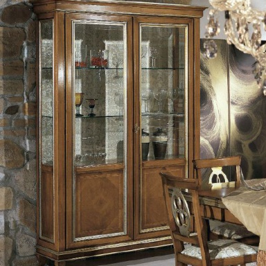 Showcase Armonie from the Italian manufacturer Arve Style. The product on short curly legs, with two wings. Frame, base made from solid wood. The top veneer. The wood fibers create a rhomboidal pattern. Shelves and wall 2/3 are made of transparent glass. The color palette to choose from the range. The decor is coated with silver and inner finish of the Damascus brocade. Product in a classic style, perfectly fit into the classic interior.